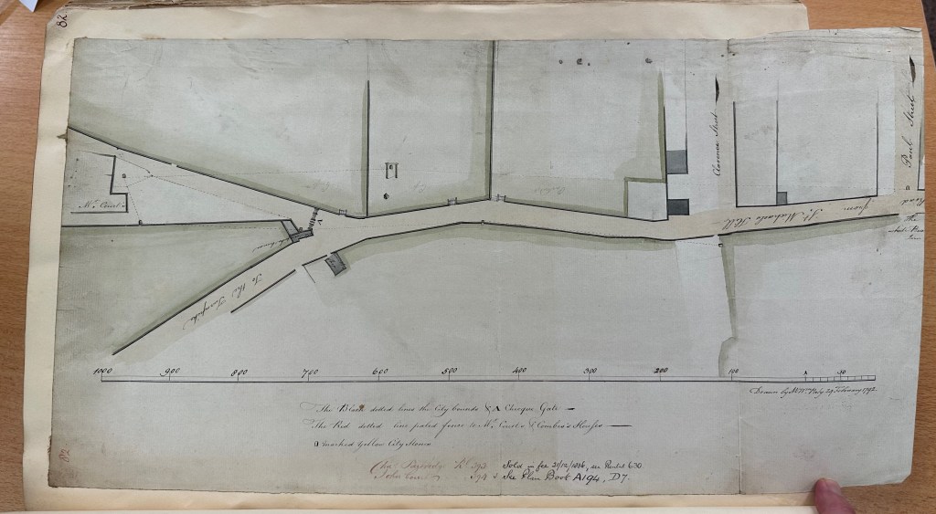 In 1820 the city’s gallows were moved from St Michael’s Hill to the roof of the New Gaol down on Cumberland Road. So, the gallows itself is not marked on the 1829 plan. It does clearly show, however, that the object that I thought might be the base of Bewell’s Cross lay in Gallows Field, right in the path of the new road.