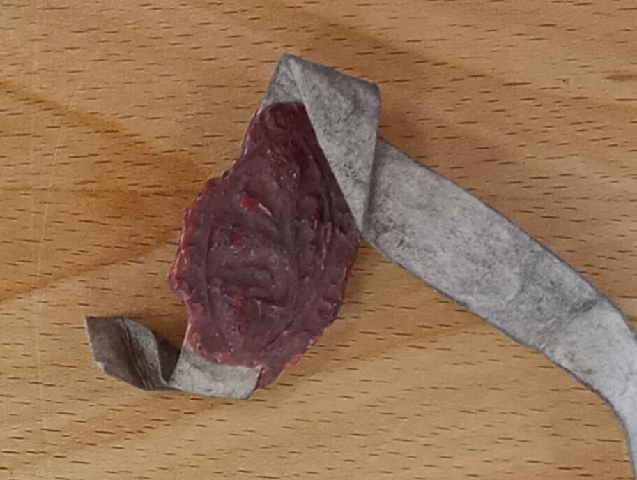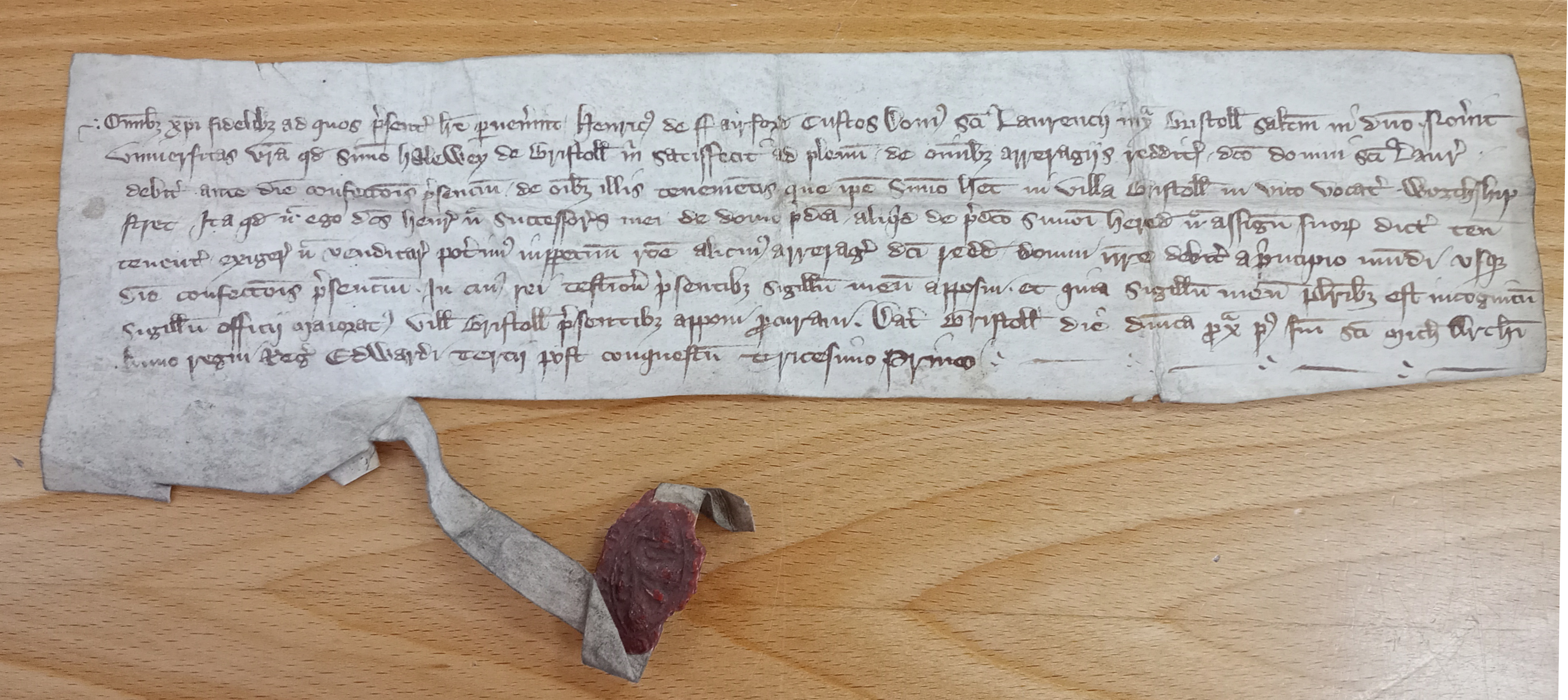 The donor’s seal is attached. It is now much worn, but it is vesica-shaped, that is a pointed oval, indicating that it belonged to a cleric. It is the only surviving seal from St Lawrence’s. The document also says that, in case Henry’s seal is not well-known, the seal of the mayoralty will be added, which would be an additional guarantee of the act. Unfortunately it is no longer there. This is quite a small piece of parchment but it tells us a great deal about St Lawrence’s. There is the name of the master and we see him managing the endowment that had been acquired to support the leper community. It is evidence for charitable giving among medieval Bristolians and indicates that, as well as its agricultural holding, the croft, St Lawrence’s also had urban interests, given by benefactors. Altogether, it is an important document and has had an adventurous life, as I was about to find out.