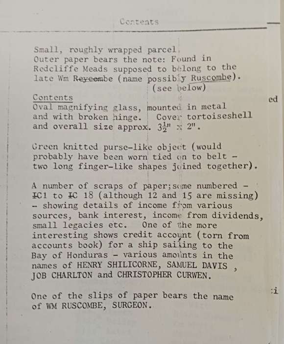 Finally, the paper wrapper everything was placed in, presumably by Elton the Town Clerk, confirms it to be the one referred to by the newspapers. The roughly written inscription reads ‘found near Redcliff Meads supposed to belong to the late Mr (or Mrs) ___________’, but the crucial name is torn off and the missing piece is not in the bundle.