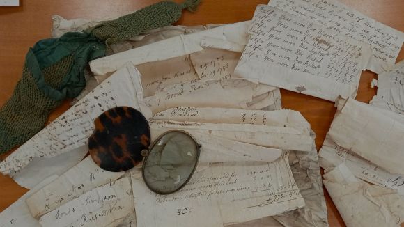 Of the four keys allegedly in the bundle when it was discovered, there is now no sign. But by far the most curious objects are the empty green worsted purse (or reticule, a simple double-pocketed piece of knitwear for storing coins), and the reading glass with a tortoiseshell cover: