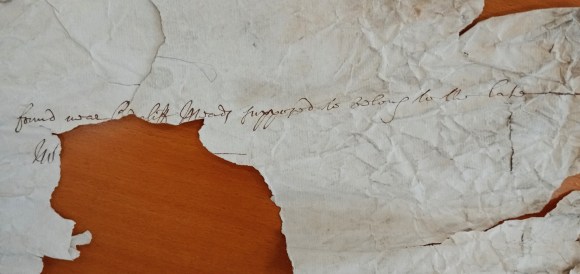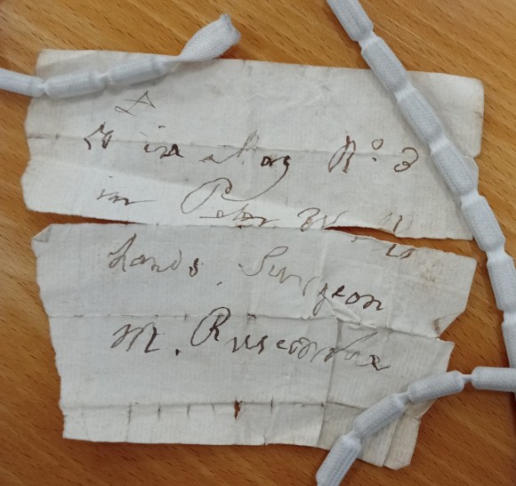 Whoever initially catalogued these items didn’t connect them to the Ruscombe case, and at first read Mrs Ruscombe as ‘Wm Reycombe’. The only manuscript in the bundle bearing Ruscombe’s name can be seen in the photograph below, which reads, ’50 in a Bag No.3 in Peter Wells hands, Surgeon. M. Ruscombe’.