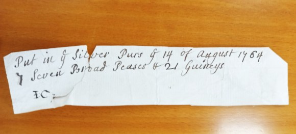 Another fragment mirroring the press reports states ‘Put in ye Silver Purs ye 14 of August 1764 7 Seven Broad Peases & 21 Guineys’. The seven ‘broad pieces’ referred to here are not identified as 3/6d coins, as they are in newspaper accounts, but the two sources are clearly referring to the same items.