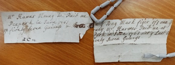 The receipts in the bundle are in a dilapidated state, some of them mere fragments. Most are just lists of payments and of interest gained on investments, but one or two concern the bagging of money, and these are the ones quoted from in contemporary press coverage, confirming it as a case of robbery as well as murder. Two fragments pieced back together include the phrase, ‘Fifty Seven Guineas & [tied up] in ye Bag Mark Figer of 1 One’.