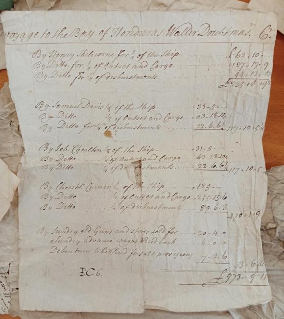 The signature ties the bundle to the family, as does the ‘credit account for a ship sailing to the Bay of Honduras’, as noted in the catalogue. The Bristol merchant, Christopher Curwen, one of the named investors in the voyage, was Frances’s first husband. She married James Ruscombe after Curwen’s death in 1749.19